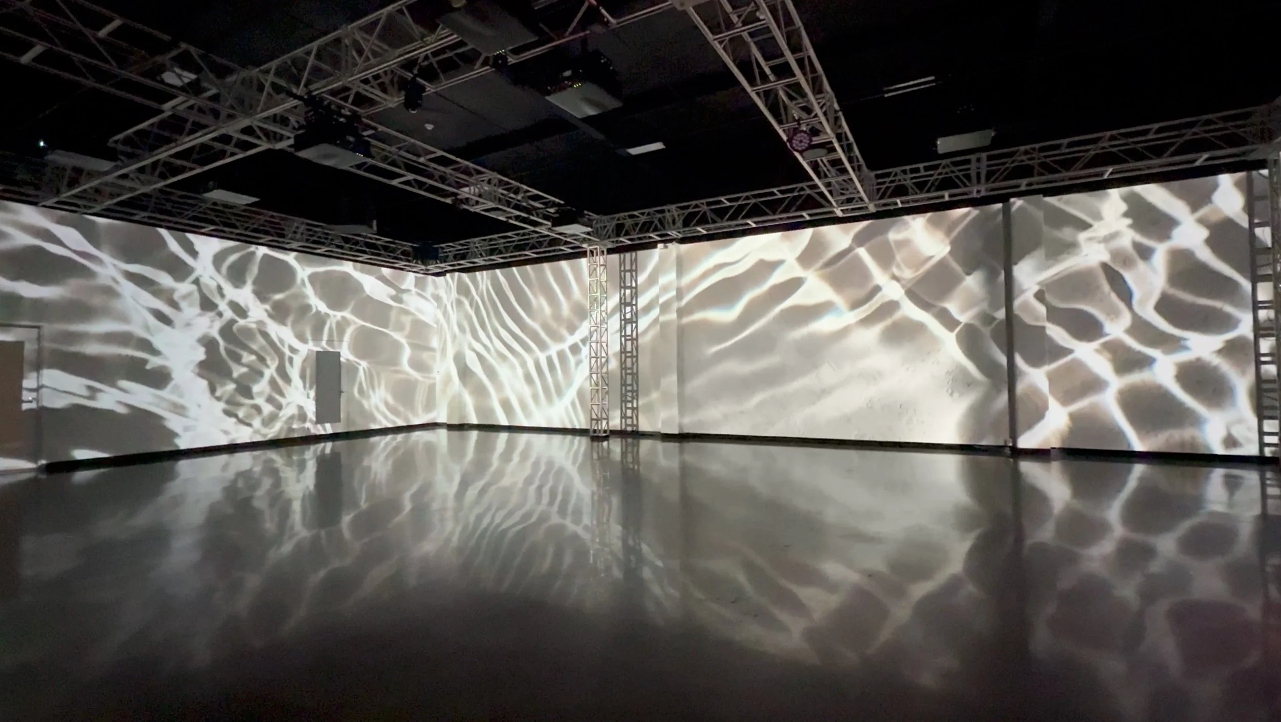 Aquascape Gradient I is a timeline-based installation that presents water as a field of motion, unfolding across three stacked panels as a continuous gradient of light, depth, and time.